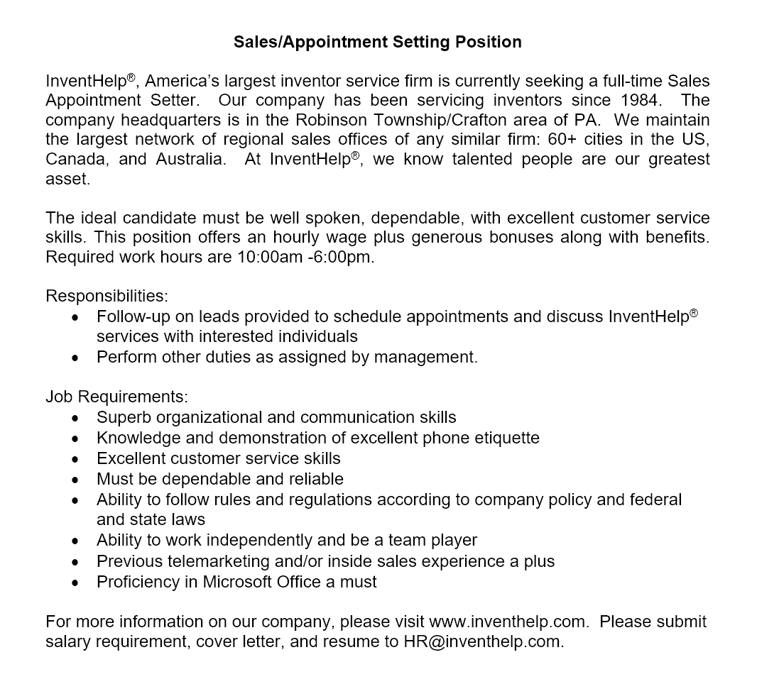 please call (412) 288-1300 or email HR@inventhelp.com.